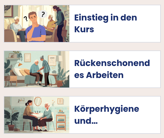 Der Kurs ist ideal, wenn Sie einen Angehörigen pflegen oder nachbarschaftlich helfen und sich mehr Sicherheit im Umgang wünschen. Er hilft Ihnen bei Fragen zu Pflegegrad, Pflegegeld, Demenz, Intimpflege und Entlastungsmöglichkeiten. Auch wenn Sie nur einzelne Themen brauchen, können Sie den Kurs wie ein Nachschlagewerk nutzen.